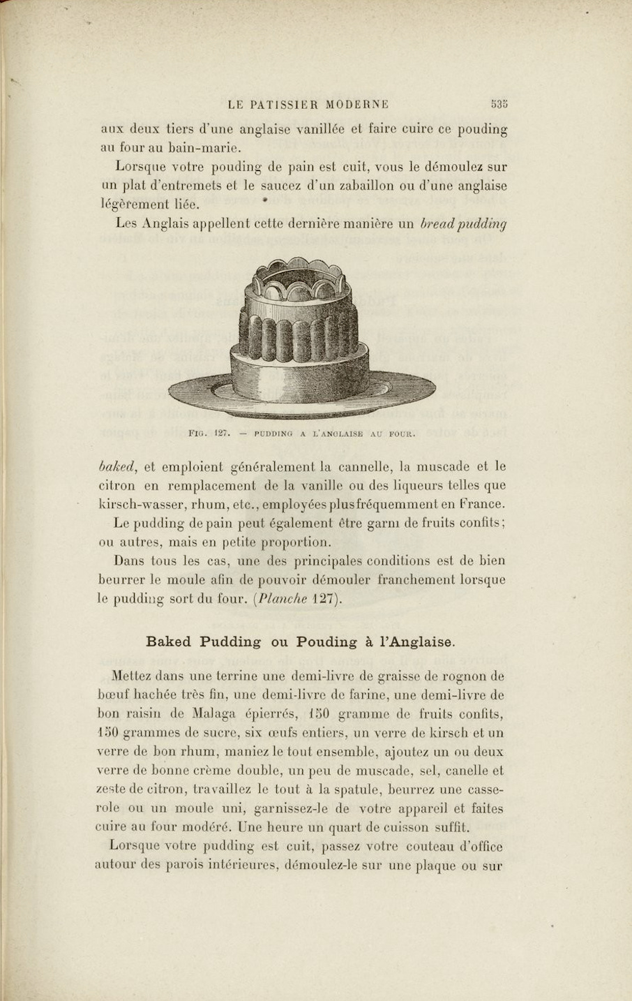 Point of fact, I want to note here that Joseph Menon’s English Pudding or Pouding à l’Angloise from his 1755 cookbook Les Soupers de la Cour is made with flour, eggs, cream…then “pralined orange blossoms, chopped green lemon peel, six eggs, beaten egg whites, a pound of chopped beef fat, melted but not browned, a small handful of currants or raisins from Provence, twelve dried figs, all well mixed.” It is then placed “in a pan that is the right size for the dish you are going to serve; bake in the oven for an hour; serve drained of its fat.” Half a century later, Antonin Carême’s Le Pâtissier Royal Parisien is filled with recipes for puddings of all sorts, almost all fruit based.
